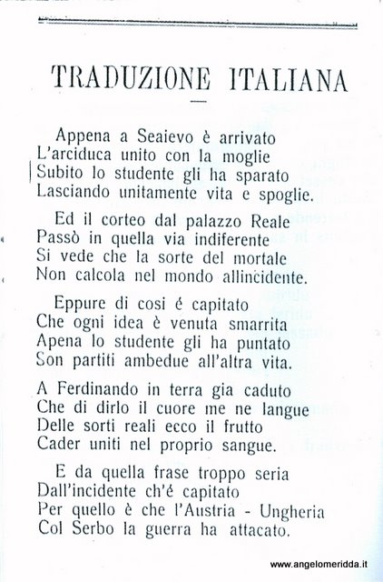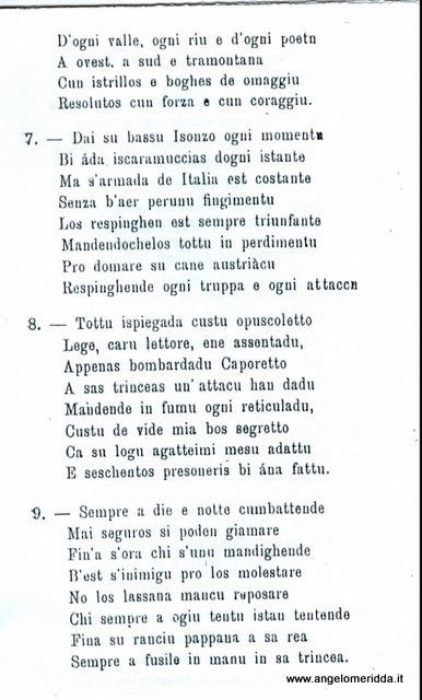 Centenario Prima Guerra Mondiale In occasione del "Centenario" della Prima Guerra Mondiale ho pensato di pubblicare in internet due "Libretti" di poesie in Lingua Sarda scritte da mio nonno Giuseppe Meridda Saba di Ozieri che parlano di quella guerra. Meridda  Saba  Giuseppe              di  OZIERI      CANZONE   SARDA             MESSA PER  LA   GUERRA   EUROPEA      Su quello che scrivono i giornali        con la traduzione in Italiano             ---------------                        Proprietà  letteraria riservata              ---------------                            OZIERI     Tipografia Giovanni Satta Areddu                                -----                              1914 "MERIDDA SABA GIUSEPPE MARIA" Era nato ad Ozieri (SS) il 17 Settembre 1864. Figlio unico di Antonio ed Elisabetta Saba rimase orfano di padre in giovane età . Da giovane faceva il contadino ma poi, preso dalla passione per la poesia, girava di paese in paese per cantare le sue poesie durante le feste. Riferendoci alle sue poesie che ci sono pervenute possiamo considerarlo un "Cantore Cronista" perché portava nelle città  e nei paesi le notizie sui fatti più importanti che succedevano in Sardegna, in Italia e nel mondo. Dei cinque libretti che ci sono pervenuti uno tratta di una poesia d'amore e della partenza di un giovane per fare il soldato e gli altri quattro raccontano, quasi come "una cronaca in versi" le gesta eroiche dei soldati Italiani (ed in particolare dei Sardi) che presero parte alla guerra in Libia del 1911/1912 contro la Turchia ed a quella contro l'Austria del 1914/1918.   =====================================================                          CANZONE   SARDA    Da Saraievo l'ambasciata dell'Arciduca unito alla moglie mentre con la vettura camminava o per gusto o per proprio dovere a un'ora che neanche ci pensava non conviene neanche che lo dica viene da Serbia un astuto studente privandoli della vita unitamente.  Per primo con le bombe ha provato e poi un fucile ha preso il Principe della bomba si è accorto e ha alzato il braccio nella vettura quando col fucile ha provato e perché non è riuscito nel suo intento senza nessun zelo e cautela subito si è armato di rivoltella.  ---- 4 ----  Appena è uscito dalla stazione reduce dalle manovre militari lo studente ha rotto il cordone per accontentare i familiari compiuto ha il cattivo proposito di assassino dei migliori esemplari e per questo motivo in ogni terra dicono che si è sviluppata la guerra.  Appena che il fatto si è saputo la Serbia alla guerra ha invitato la Germania la Serbia ha favorito e la Francia anche hanno intimato il Belgio si è anche intromesso l'Inghilterra le navi ha armato l'Italia che con tutti è alleata per quello neutrale è rimasta.    Il cinque di Agosto all'unanimità l'Austria due navi ha mandato in Tunisia e corrono come il vento a Bona e a Filipiville hanno bombardato Poincare che sente il lamento ed era di diritto a difendere lo stato si è decisa ed era giusta la ragione e subito è entrata in azione. --- 5 ---  I Francesi erano mezzo milione dai vosgi il giorno hanno marciato nel sito di ogni squadrone dalla frontiera si sono appostati due o tre attacchi si sono dati cominciando a suonare il cannone che per l'attacco forte che si dettero la città  di Multose allora presero.  Il forte meltz rimane distrutto a Namur la battaglia hanno attaccato di sangue la terra hanno impastato come mai nei miei tempi ne ho visto di quanto è l'Austriaco accanito contro la Serbia ed il Belgio è irato da entrambe le parti dicono siano periti ventimila tra morti e feriti.  Vaterlò ne ha visto altre volte da Napoleone in quell'impresa l'Inglese entra con tanta tirannia prendendone per il Belgio la pretesa due armate di cavalleria attaccano la tedesca con l'inglesa con fierezza l'attacco si danno facendo strage della carne umana. ---- 6 ----  Il 23 di agosto da  annottare la Russia è entrata in azione nella via che aveva preparato trova la Germanica ispezione la Germania aveva preparato dieci corpi di armata uniti la Russia che ha forti guerrieri ne ha fatto ottomila prigionieri.  Nella Alsazia meridionale è dai tedeschi sgombrata a Baden hanno fatto ritirata nel posto più familiare può discorrere ora ogni mortale quanta gente morta che c'è senza prendersene alcuna cura ai morti dare sepoltura.  Il trenta di agosto di comune accordo Poincare una lettera ha mandato ai Russi per aiutarlo ad entrare in azione in quel momento essendo tutta la Francia in subbuglio cento cinquanta mila ne ha mandato e quando in azione essi entrarono a Leopoli di nuovo riconquistarono.  ---- 7 ----   In Leopoli entrò come un tiranno l'esercito tedesco devastando che anche quattro mila italiani quelli che dimoravano a Trieste hanno preso anche le armi in mano ma il Russo numeroso sta avanzando mettendo in campo otto divisioni senza i prigionieri e (i) cannoni.  Tanto in Liegi che in Alsazia sette giorni l'attacco c'è stato di quanto è il tedesco infuriato a migliaia ogni giorno vi cadevano in Vosgi e in Lorena tutti sapevano che avevano i F