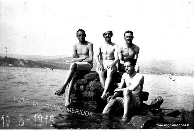 LA PRIMA GUERRA MONDIALE NELLE  FOTOGRAFIE DELL'OZIERESE GAVINO MERIDDA          Dal 1919 al 1924           .....................................................................Se qualcuno individua i luoghi o le persone delle fotografie, se vuole, può comunicarmelo al mio indirizzo angelomeridda@gmail.com ....................................... Il negativo di questa fotografia ha la data del 10 - 8 - 1919 e quindi dobbiamo supporre che tutte le foto fatte al mare (non sappiamo se si tratta di mare o di lago) o in località  dove appaiono distese d'acqua, siano fatte nello stesso periodo. Finita la guerra Gavino Meridda (il primo da destra) diceva che era andato ad Ischia per fare le cure termali. Non sappiamo se si tratta dell'isola o di Ischia in provincia di Trento vicino al lago di Caldonazzo o a quello di Levico Terme. Il primo a sinistra è forse il pilota che appare nella foto dell'incidente con i soldati che cercano di spegnere un incendio pubblicata nella pagina del 1917 - 1918.     Il primo da destra è Gavino Meridda. Il personaggio al centro in piedi è Gavino Meridda. La guerra è finita e ritornano i sorrisi. Panorama sul mare o sul lago ? Uno stabilimento balneare ? Panorama sul mare o sul lago ? 8 Febbraio 1922 Un militare fotografato da Gavino Meridda nel  porto di Cagliari. 8 Febbraio 1922   Gavino Meridda fotografato nel porto di Cagliari (a sinistra si vede il Palazzo Comunale). Si appoggiava ad un robusto bastone perché zoppicava in seguito alla frattura del piede sinistro dopo la caduta con l'aereo a Casoni il 17 - 9 - 1918. Era andato a Cagliari per essere visitato dal Collegio Medico di 1° grado.   Gavino Meridda dopo il congedo. Il suo casco e la giubba da pilota che ancora si conservano Finita la guerra, Gavino Meridda fu uno degli organizzatori della Sezione di Ozieri dei Mutilati ed Invalidi di Guerra della quale fu anche nominato Presidente. Turis Salvatore Pinna Diego Demurtas Pietro Serg.  Meloni Maria Ubaldo Pancrazio Falzoi Raimondo Solinas Damiano Cola Salvatore Meloni Leonardo Biddau Giovanni Campana Ant. Dettori Pietro Serg. Meridda Gavino            Pinna Giovanni            Cubeddu Giov. M.            Mesalimba Salvatore            Era Gio M.            Terrosu Nicolò             Arcadu Antonio             Nidda Antonio             Sanguibetti Giov.             Sistu Giov. M.             Lai Francesco |