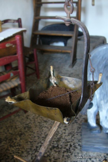 Per visualizzare il video sull'accensione del fuoco mediante acciarino e la pietra focaia clicca qui Nel focolare, dove il fuoco non veniva mai spento, c'era sempre una pentola con dentro del cibo da cucinare o piena solo di acqua da scaldare. In un angolo del focolare c'era sempre una caffettiera dove veniva tenuto in caldo il "caffè". Si trattava di una specie di brodaglia che veniva ottenuta lasciandovi all'interno i fondi di caffè ed aggiungendovi   sempre nuova acqua man mano che si prelevava il caffè.     Lo Scaldino Durante la notte, attorno al focolare venivano distese le stuoie dove dormivano le persone più grandi.  IL  TELAIO per fare le stuoie di giunco di palude: la Tifa. (sa spadola )   "Sa Mesighedda" Vicino al focolare c'era quasi sempre un tavolino dove si mangiava e si sbrigavano tutte le faccende di cucina. Questo tavolino è stato fatto artigianalmente dal padre di zia Picchicca (Salvatore Manunta di Milis) utilizzando il vecchio sportello di una finestra, presumibilmente verso la fine del 1800. "Su Candeleri" In Casa c'era sempre un attrezzo dove venivano appese vari tipi di candele per produrre la luce. "Le Candele" venivano appese a diversa altezza a seconda della necessità . "L'Acetilene" Quando serviva molta luce, chi poteva permetterselo, accendeva una lampada ad acetilene. Questa lampada ad olio chiamata "Sa Pardula" (La Formaggella) per la sua particolare forma che ricorda quel dolce, aveva quattro stoppini che potevano essere accesi tutti assieme o singolarmente. "S'Incannittu" (Il graticcio di canne) Stava sospeso sopra il focolare e serviva per affumicare e disseccare i salumi, il formaggio, la ricotta, ecc. In questa immagine si vedono bene i contenitori, quelli in legno per mettere il formaggio (S'aiscu) e quelli in giunco per mettere la ricotta (Sa Frussella) |