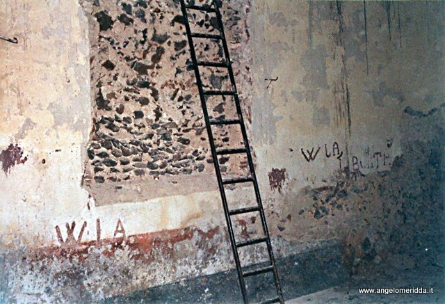 Fotografie delle incisioni e dei disegni nella chiesa di San Giorgio Le incisioni antiche In alcune pietre degli stipiti della facciata e in una pietra della parete esposta a sud, sono stati incisi dei segni a forma di "clessidra" sormontata da una croce. La forma di clessidra ricorda molto la "bipenne" (scure a due tagli) o "Croce Ascia", simbolo della purificazione che appartenenti ad alcune correnti religiose Giudeo-Crisitane, portavano sempre con se appesa alla cintola. Gli stessi simboli sono presenti in alcune pietre della chiesa di San Giovanni di Tramatza incisi più o meno ad altezza d'uomo. Quelli di Milis invece si trovano a diverse altezze, anche in cima alla facciata dove però possono essere state collocate le pietre dove erano incisi, dopo i restauri del 1937 quando venne rifatta la facciata. Trovandosi in origine ad altezza d'umo, questi segni possono essere stati incisi da pellegrini in occasione di qualche particolare festa o cerimonia. La spiegazione più semplice e logica è che questi segni rappresentino "Il Calice", dove vengono messe le "Ostie Consacrate",   che è sempre sormontato da una croce. "INCISIONI ANTICHE"    Le incisioni che precedono sono tutte su pietre che si trovano a metà , ed oltre, della facciata.  Questo simbolo, della fotografia qui a fianco, è inciso in una pietra collocata in cima alla facciata. La pietra è stata spezzata nel riutilizzo ed il taglio ha sfiorato anche l'incisione. Questo  è  l'unico segno inciso ad altezza d'uomo che è rimasto probabilmente nel sito originale. Si trova nella parete laterale esposta a sud. Qui ci sono anche alcune incisioni circolari, fatte con la punta dello scalpello, che sono presenti a Tramatza. INCISIONI A SAN GIOVANNI DI TRAMATZA   che ha la facciata orientata a ponente Si notino le incisioni tondeggianti fatte con la punta dello scalpello in prossimità  del simbolo a forma di clessidra. Questa incisione appare danneggiata. A Tramatza  sono quasi sempre presenti i punti incisi con lo scalpello. PITTURE  MODERNE Durante l'ultima guerra, 1940 - 1945, la chiesa venne requisita ed occupata dai soldati che la trasformarono in dormitorio. I quadri e le suppellettili  vennero ricoperti e protetti in un qualche modo ma le pareti vennero utilizzate dai soldati per disegnarci e scriverci frasi utilizzando vernice rossa. La frase che ricorre spesso è " W  LA LIBERTA' ". |
